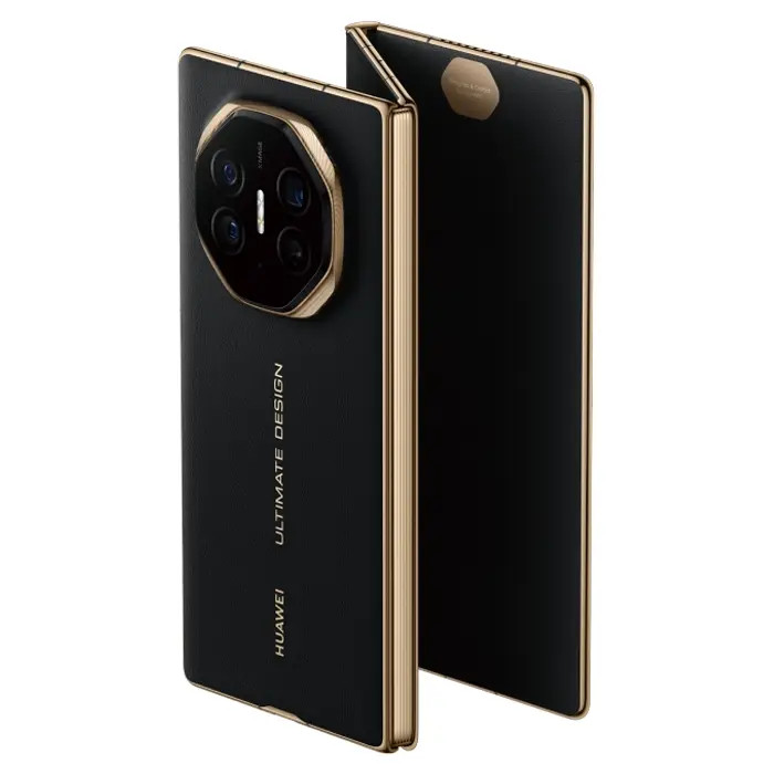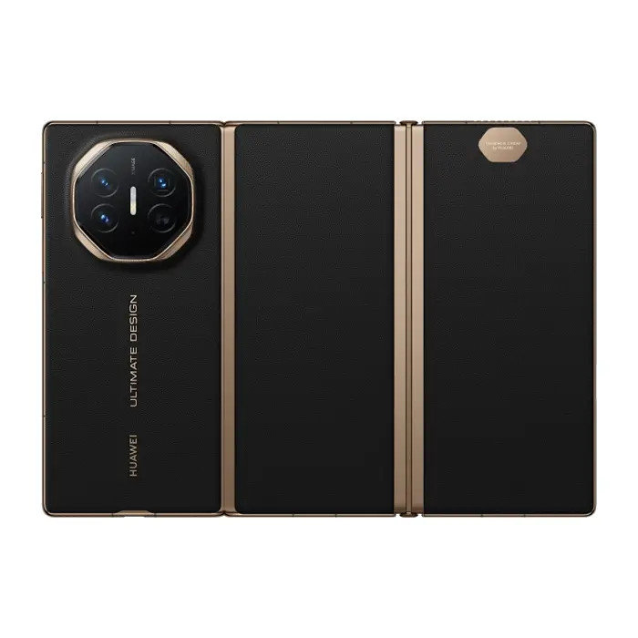 Huawei Mate XT Ultimate در رنگ مشکی عمیق تر و جذاب تر به نظر می رسد و وجود لبه طلایی جلوه خاصی به آن می بخشد. این بار در این طراحی منحصر به فرد، قاب محافظ ویژه ای برای هواوی Mate XT Ultimate در نظر گرفته شده است که می توان گفت مکملی هم برای محافظت از ساختار تاشو جانبی آن است و همچنین یک براکت، سبک و محکم بر روی آن ساخته شده است.
